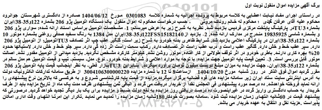 در راستای اجرای مفاد نیابت اعطایی به کلاسه مربوط به پرونده اجرائیه به شماره کلاسه  0301083  مورخ  1404/06/12 صادره از دادگستری شهرستان  جوانرود محکوم علیه آقای عرفان محمدی  ؛ محکوم له خانم روناک مروتی      ، حسب درخواست محکوم له اموال منقول  یک دستگاه اتومبیل پژو 206 بشماره 122و35-38/ایران  در پارکینگ پایتخت مرکزی فردیس بازدید شد. نظریه به شرح زیر به عرض میرسانم: 1- مشخصات اتومبیل براساس اسناد ارائه شده: سواری پژو 206 tu3 بشماره 122و35-38/ایران مدل 1384 به رنگ سفید صدفی روغنی بشماره موتور 10fss15182140 و بشماره شاسی 19835925 مندرج در مدارک ارائه شده. 2- بازدید از اتومبیل: از اتومبیل پژو 206 tu3 بشماره 122و35-38/ایران در پارکینگ اعلامی بازدید شد. شرایط ظاهری بدنه خودرو به شرح زیر است: گلگیر عقب چپ اثر تصادف دارد. سپر عقب خط و خش دارد. گلگیر عقب راست و درب عقب راست اثر تصادف دارد. رکاب سمت راست اثر زده گی دارد. سپر جلو خط و خش دارد. لاستیکها حدود 20% بهره کاری دارند. باطری خودرو در اثر توقف طولانی از کار افتاده. موتور روشن نشد. کیلومتر کارکرد مشخص نگردید. بازدید میدانی از اتومبیل مقدور نشد. اصالت موتور قابل بررسی است. 3- تعیین قیمت پایه اتومبیل جهت مزایده: با توجه به موارد اعلامی و شرایط بدنه خودرو، نوع، مدل، سیستم، تیپ و قیمت اتومبیل هم مدل سالم در بازار فعلی، به نظر اینجانب قیمت پایه اتومبیل پژو 206 tu3 بشماره 122و35-38/ایران، جهت مزایده به میزان مبلغ دویست میلیون تومان برآورد میگردد.  بنابراین  مقرر گردید اموال فوق الذکر  در  روز شنبه  مورخ 1404/10/20    ازساعت8 تا 12 با شماره مزایده 3004106300000220  از طریق سامانه تدارکات الکترونیک دولت به آدرس اینترنتی سایت ستاد ایران زیر سامانه مزایده های قوه قضائیه برگزار میگردد.مزایده از قیمت پایه کارشناسی شروع و به هرکسی که بالاترین نرخ پیشنهادی را ارائه نماید فروخته خواهدشد. ده درصد مورد پیشنهادی فی المجلس نقداً از خریدار دریافت می گردد و الباقی ثمن پیشنهادی ظرف مدت یک ماه از تاریخ مزایده باید از طرف خریدار به حساب دادگستری واریز گردد در غیراینصورت ده درصد دریافتی روز مزایده به نفع دولت ضبط و مزایده برای یک بار دیگر تجدید خواهد گردید. درصورتی که پیشنهاد قیمت در 60ثانیه انتهای زمان مزایده ثبت شود ،سامانه بصورت خودکار180ثانیه زمان مزایده را تمدید می نماید .تکرار این امرتا انتهای وقت اداری امکان پذیراست .هزینه نقل و انتقال به عهده خریدار می باشد.