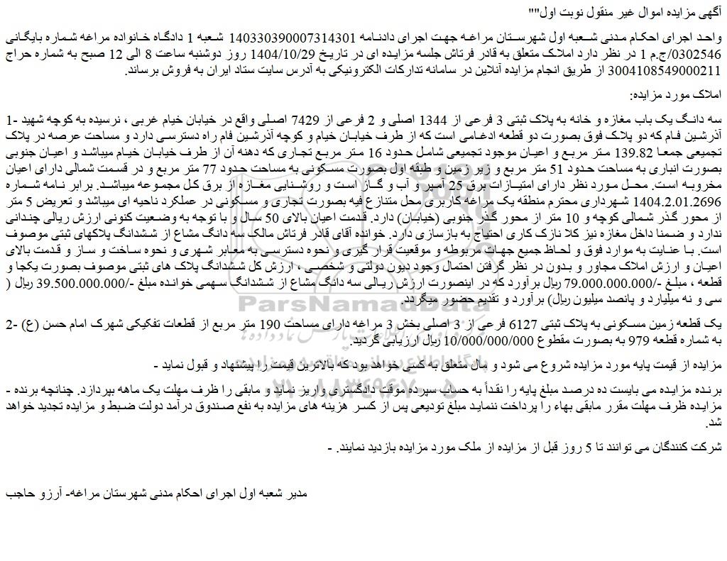 واحد اجرای احکام مدنی شعبه اول شهرستان مراغه جهت اجرای دادنامه 140330390007314301 شعبه 1 دادگاه خانواده مراغه شماره بایگانی 0302546/ج.م 1 در نظر دارد املاک متعلق به قادر فرتاش جلسه مزایده ای در تاریخ 1404/10/29 روز دوشنبه ساعت 8 الی 12 صبح به شماره حراج 3004108549000211 از طریق انجام مزایده آنلاین در سامانه تدارکات الکترونیکی به آدرس سایت ستاد ایران به فروش برساند.
