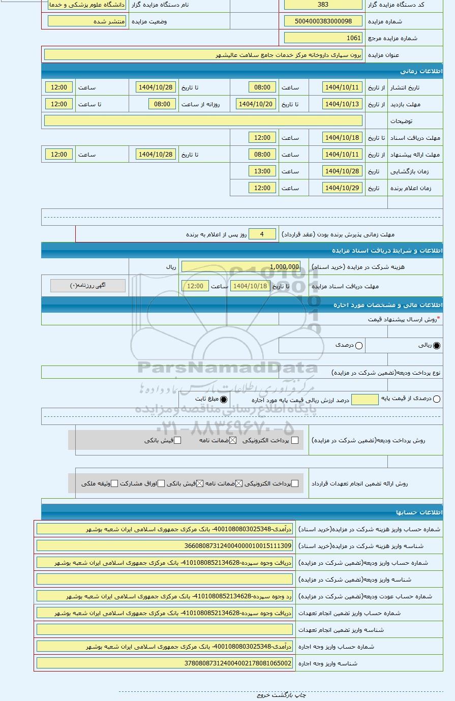 | کد مزایده گزار | 383 | نام دستگاه مزایده گزار | دانشگاه علوم پزشکی و خدمات بهداشتی درمانی بوشهر | |