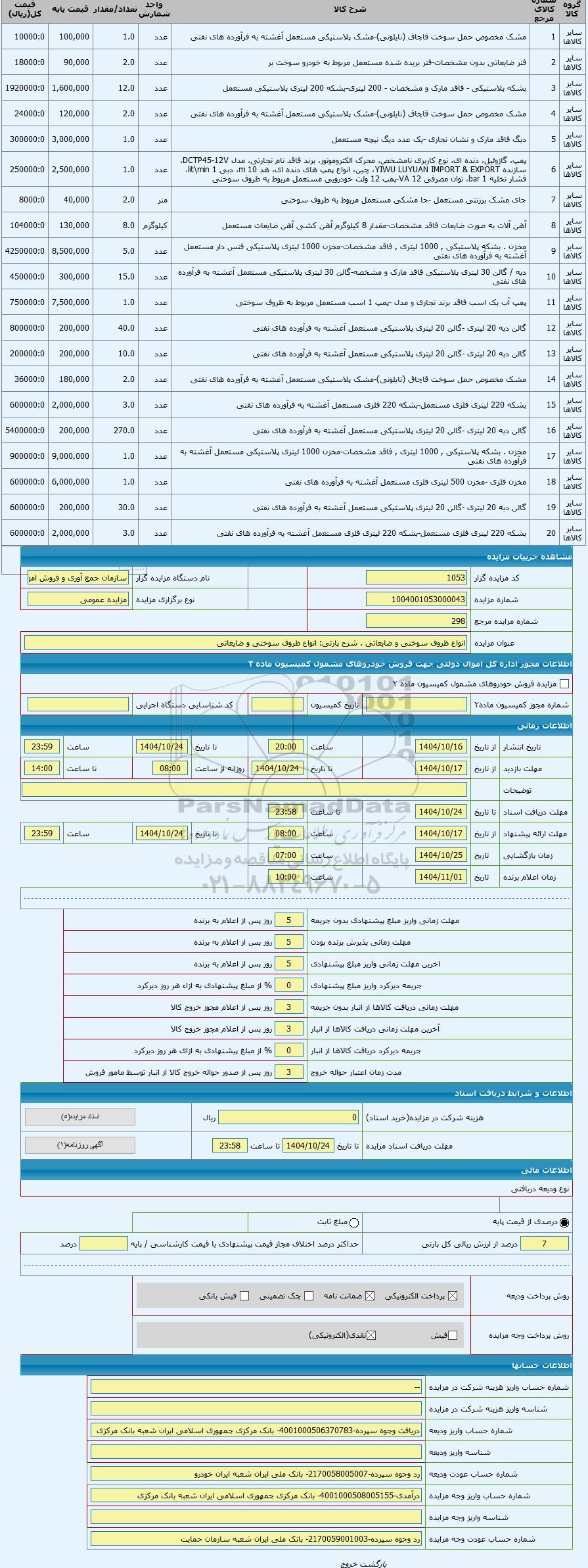 | کد مزایده گزار | 1053 | نام دستگاه مزایده گزار | سازمان جمع آوری و فروش اموال تملیکی | |