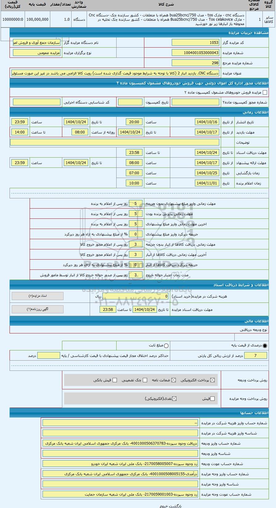 مزایده عمومی مزایده دستگاه CNC. بازدید انبار 2 (کالا با توجه به شرایط موجود قیمت گذاری شده است) رویت کالا الزامی می باشد در غیر این صورت مس برگزار میگردد. از کلیه افراد متخصص و شرکتهای واجد شرایط دعوت به عمل میآید تا در این مزایده با کد خبرگزاری پارس نماد : 10109704 شرکت نمایند تاریخ شروع مزایده : 1404/10/16 مهلت شرکت در مزایده: تا پایان روز 1404/10/24 مکان برگزاری اموال واگذاری استانهای مزایدات استان تهران و دستهبندیهای مربوط به این حراجی تجهیزات کارخانه ها و ماشین آلات صنعتی, دستگاه تراش میباشد.