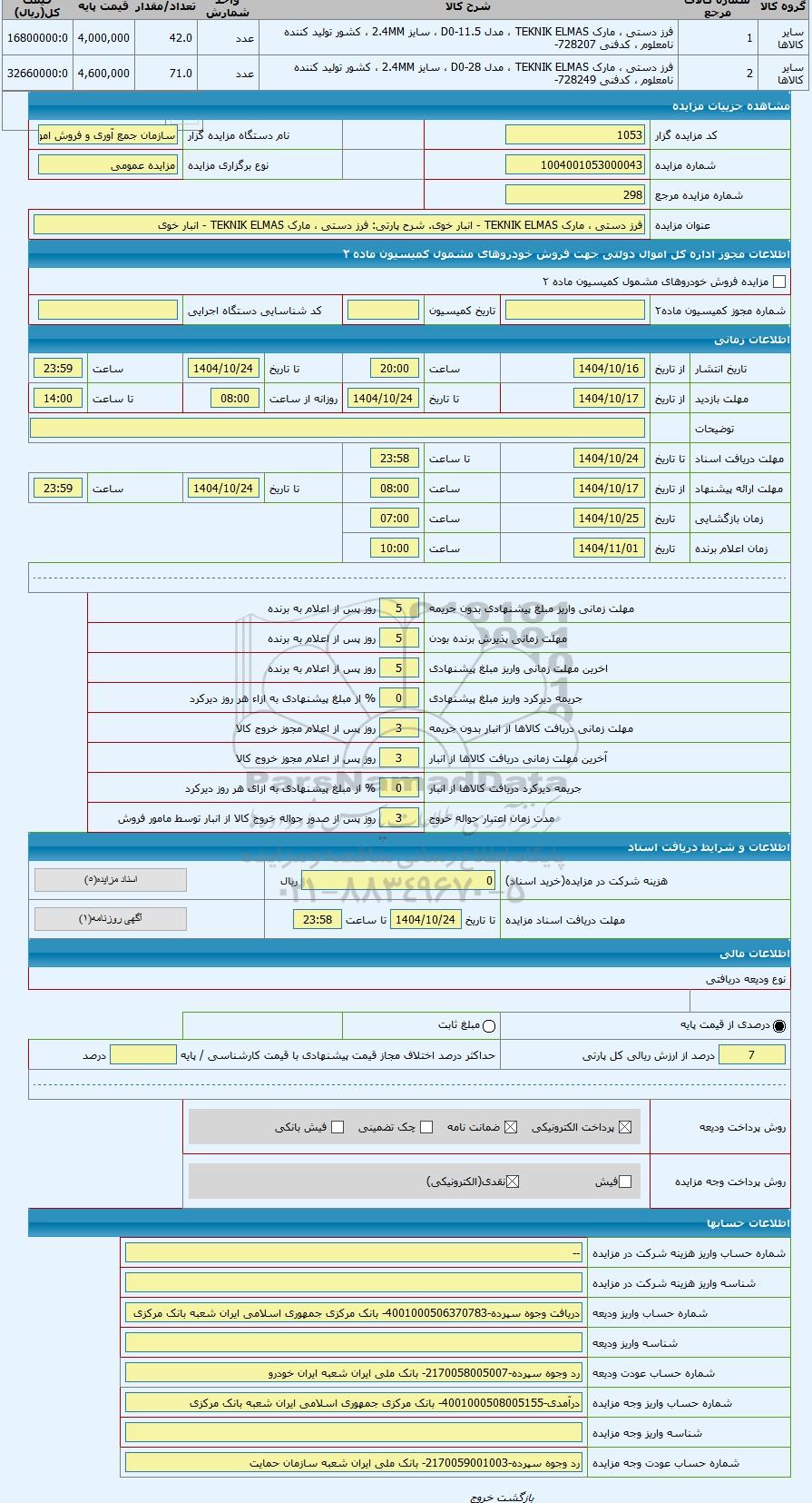 | کد مزایده گزار | 1053 | نام دستگاه مزایده گزار | سازمان جمع آوری و فروش اموال تملیکی | |