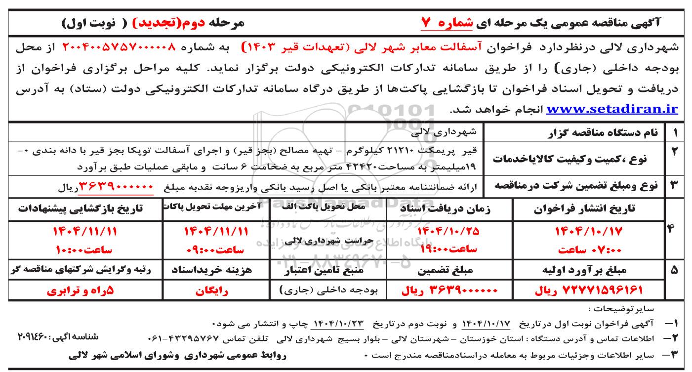 شهرداری لالی در نظر دارد فراخوان آسفالت معابر شهر لالی (تعهدات قیر 1403)  به شماره 2004005757000008 از محل بودجه داخلی (جاری) را از طریق سامانه تدارکات الکترونیک دولت برگزار نماید.  کلیه مراحل برگزاری فراخوان از دریافت و تحویل اسناد فراخوان تا بازگشایی پاکتها از طریق درگاه سامانه تدارکات الکترونیکی دولت (ستاد) به آدرس سایت ستاد ایران انجام خواهد شد