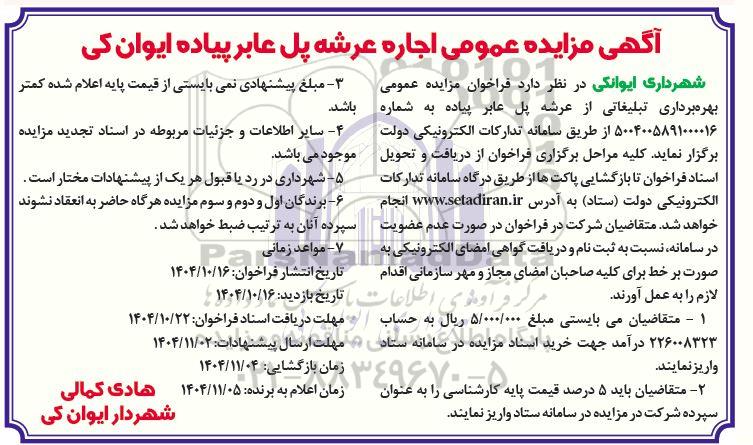 آگهی مزایده عمومی اجاره عرشه پل عابر پیاده ایوان کی