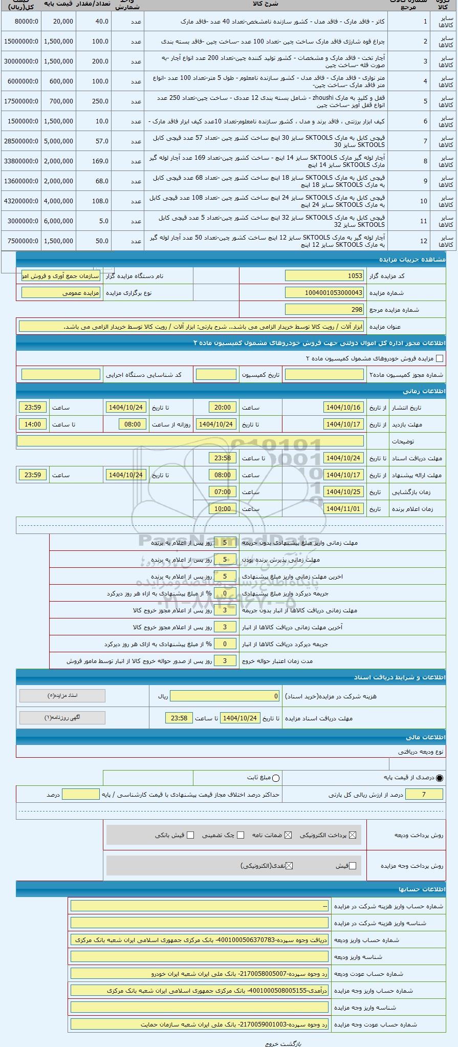 | کد مزایده گزار | 1053 | نام دستگاه مزایده گزار | سازمان جمع آوری و فروش اموال تملیکی | |