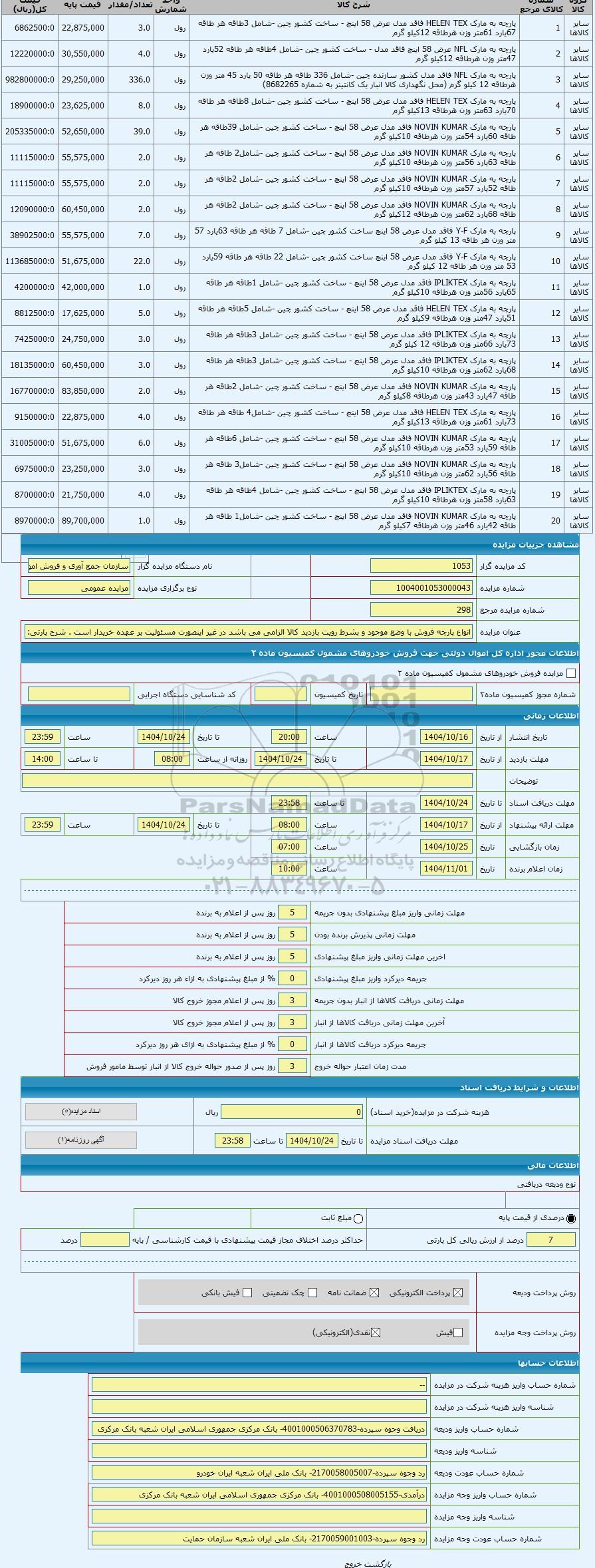 | سایر کالاها | 19 | پارچه به مارک IPLIKTEX فاقد مدل عرض 58 اینچ - ساخت کشور چین -شامل 4طاقه هر طاقه 63یارد 58متر وزن هرطاقه 10کیلو گرم | رول | 4.0 | 21,750,000 | 8700000:0 |