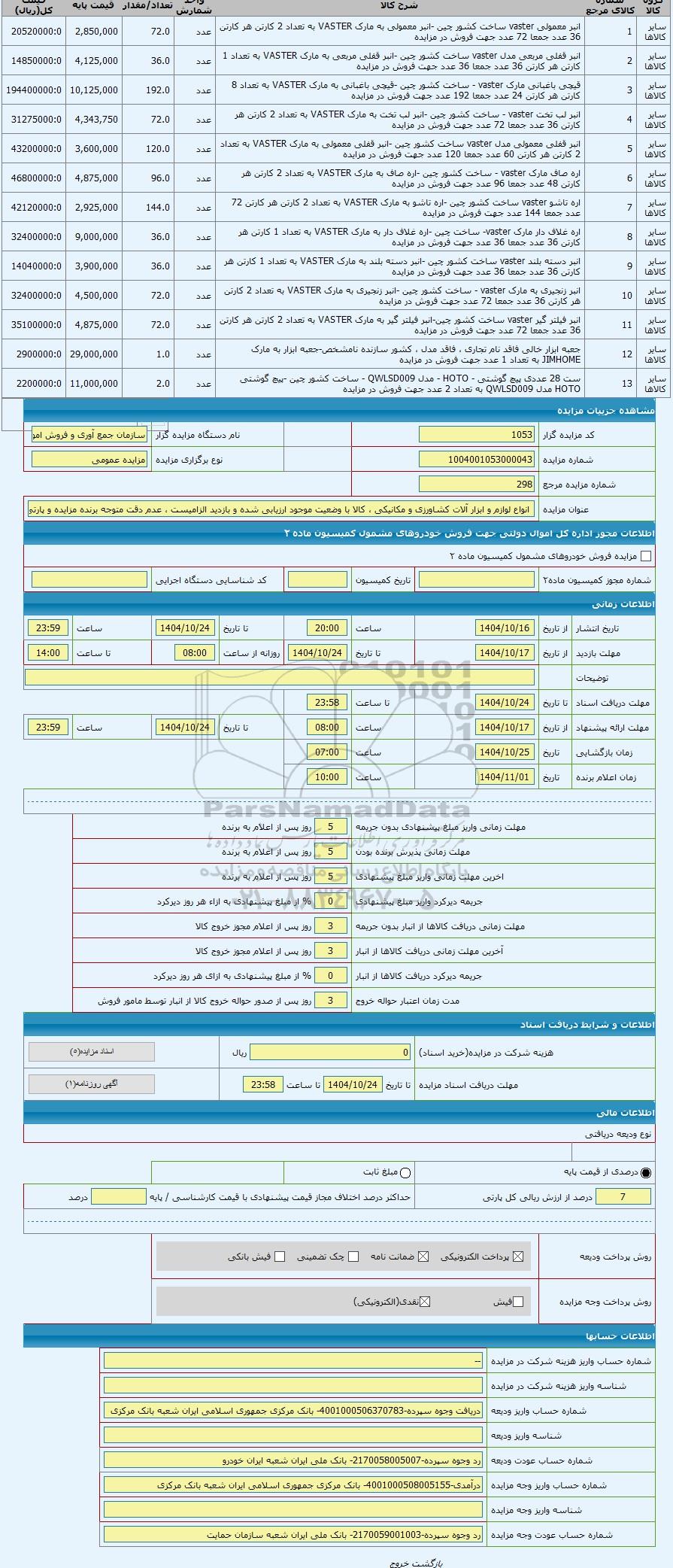 کد مزایده گزار1053نام دستگاه مزایده گزارسازمان جمع آوری و فروش اموال تملیکی