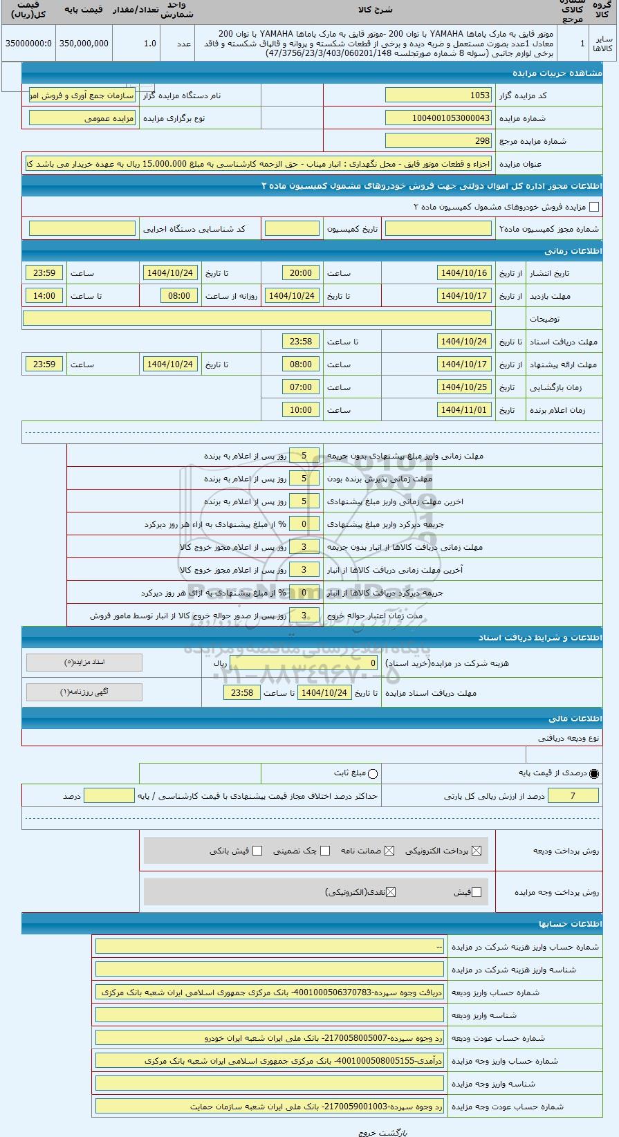 سایر کالاها1موتور قایق به مارک یاماها YAMAHA با توان 200 -موتور قایق به مارک یاماها YAMAHA با توان 200 معادل 1عدد بصورت مستعمل و ضربه دیده و برخی از قطعات شکسته و پروانه و قالپاق شکسته و فاقد برخی لوازم جانبی (سوله 8 شماره صورتجلسه 47/3756/23/3/403/060201/148)عدد1.0350,000,00035000000:0