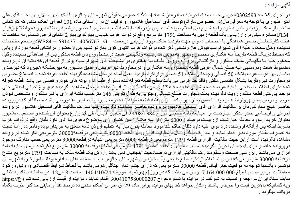 در اجرای کلاسه 0302593/اجرایی حسب مفاد اجرائیه صادره از شعبه 4 دادگاه عمومی حقوقی شهرستان چالوس له محمد امین سالاریان علیه اقای علی اکبر ظهوری با توجه به معرفی مال(در خصوص مازاد) توسط آقای اسماعیل غلامپور و توقیف آن در راستای ماده 101 اجرای احکام مدنی که کارشناس منتخب از ملک بازدید و نظریه خود را به شرح ذیل اعلام نموده است :پس ازدریافت ابلاغیه شعبه محترم با حضوردرشعبه ومطالعه پرونده واطلاع ازقرار صادره مبنی بر: ارزیابی یک قطعه زمین به مساحت 1791 مترمربع واقع درذوات غرب خیابان بهارکوی بهار2 انتهای فرعی شمالی به مختصاتutm درسیستم مختصاتws84 = 531437 4056767 g . هیئت کارشناسان ضمن هماهنگی با اصحاب دعوی جهت بازدید ملک مورد ارزیابی درمعیت نماینده وکیل محکوم علیه آ قای شهرام سیاهپوش عازم نشانی ذکر شده درذوات غرب انتهای کوی بهاردو شدیم پس ازحضور درابتدای قطعه مورد ارزیابی که محاط دریک قطعه تقریباً سه هکتاری محصورومجهز به دوبین مداربسته ونگهبانی هست درمدخل ورودی قطعه مذکورپس از هماهنگی نماینده وکیل محکوم علیه با نگهبانی ملک مذکور و بازگشائی دروازه ورودی ملک سه هکتاری در مشایعت آقای شهرام سیاه پوش از قطعه ای که نقشه آن درپرونده مضبوط هست ودرمنتهی الیه ضلع شمال غربی قطعه محصوروسه هکتاری و درمجاورت نهرعریض وعمیق مشهور به نهرخشکه هچیرود که نهرحد و سامان بین ذوات غرب پلاک 50 اصلی وچاخانی پلاک 51 اصلی قراردارد بازدید بعمل آمده درمحل مشاهده گردیده قطعه تعرفه شده با اضلاع مضرس درمجاورت نهروتقریبا بشکل هندسی مثلثی وفاقد حد غربی می باشد سطح قطعه تعرفه شده مملو ازعلف ها و بوته های خودرو فصلی می باشد قطعه تعرفه شده دارای اختلاف سطحی با بقیه عرصه ضلع شرقی قطعه سه هکتاری می باشد آثاری از افراز قطعه درمحل مشاهده نگردیده هیچ نوع اعیانی احداثی حتی درحد پی کنی قطعه مذکوررویت نگردیده بعلت مجاورت ضلع شمالی وجنوبی به طول تقریبی 146 مترحسب نقشه ابرازی با نهرمذکور ومشخص نبودن حریم وعرض بسترنهروترانشه موجود تا عمق بستر نهر پیاده سازی نقشه قطعه تعرفه شده درمحل برای اینجانبان مقدورنمی باشد مضافاً اینکه درپرونده حاضر هیچ مدارکی دال بر مالکیت افرازی آقای اسمعیل غلامپوردرپرونده حاضر مشاهده نگردیده .تنها مدرک مالکیت آقای اسمعیل غلامپور درپرونده اجرائی و ارجاعی صدرالذکر عبارتست از: مبایعه نامه تنظیمی مورخ 28/08/1384 فی مابین آقایان علی محمد زارع بعنوان فروشنده و اسمعیل غلامپور بعنوان خریدارمورد معامله عبارتست از: بیست درصد ( 6000 متر) از سه هکتارزمین کشاورزی موضوع دعوی با آقای داود دلفان واقع درذوات غرب بشرط اینکه پس ازآنکه فروشنده دردعوی علیه داود دلفان حاکم شد مورد معامله بدون نیاز به تنطیم فروش نامه متعلق به خریدار بوده ونامبرده راساً نسبت به تصرف مقدار مورد نظر اقدام نماید و مدارک دیگری دال برمالکیت افرازی بین قطعه 6000 مترمربعی درقطعه30000 مترمربعی ذکر شده درپرونده مشاهده نگردیده است ازاین جهت مالکیت افرازی قطعه 1791 مترمربعی درقطعه 6000 مترمربعی النهایه درقطعه30000 مترمربعی حسب مدارک موجود درپرونده حاضر برای اینجانبان احراز نگردیده است . بنابراین : قطعه ادعائی 1791 مترمربعی مشاع درقطعه 30000 مترمربع ذکرشده درمتن مبایعه نامه ابرازی می باشد . بررسی صحت وسقم مدارک مالکیتی ابرازی درصلاحیت اینجانبان نمی باشد .ارزش یک قطعه ملک به مساحت 1791 مترمربع مشاع درقطعه 30000 مترمربعی که دارای استعلام ازاداره منابع طبیعی وآب خیزداری شهرستان چالوس ، بنیاد مستضعفان ، اداره اوقاف امورخیریه شهرستان نوشهر، باشدبا توجه به موقعیت جغرافیائی قطعه 30000 مترمربعی که دارای چشم اندار جنگلی هم می باشد با لحاظ شرایط اقتصادی ورونق ورکود معاملات برابر است با مبلغ 7.164.000.000 تومان می باشد.که در روز]چهارشنبه مورخه 1404/10/24 ساعت 8 الی12 در سامانه ستاد به نشانی سایت ستاد ایران مراجعه و نسبت به شرکت در مزایده با شماره حراج 3004107580000207 اقدام نمایند ، مزایده از قیمت ارزیابی شد