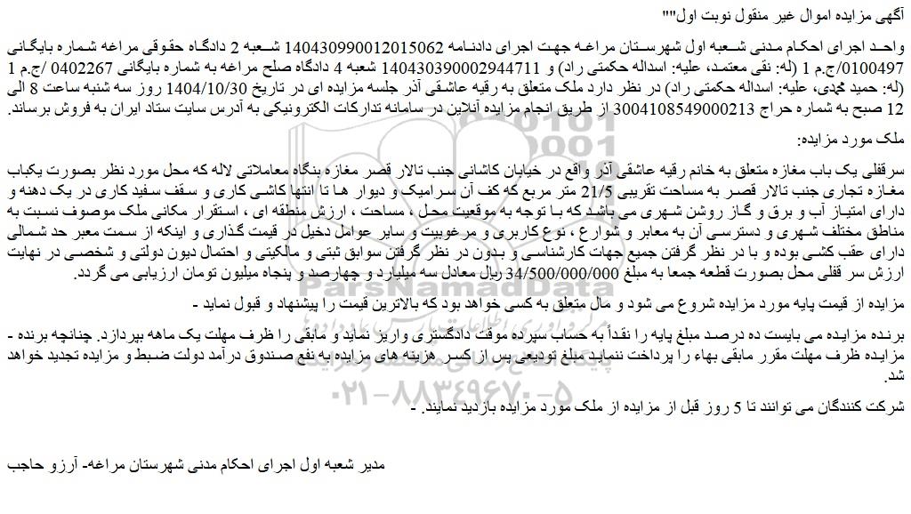 واحد اجرای احکام مدنی شعبه اول شهرستان مراغه جهت اجرای دادنامه 140430990012015062 شعبه 2 دادگاه حقوقی مراغه شماره بایگانی 0100497/ج.م 1 (له: نقی معتمد، علیه: اسداله حکمتی راد) و 140430390002944711 شعبه 4 دادگاه صلح مراغه به شماره بایگانی 0402267 /ج.م 1 (له: حمید محمدی، علیه: اسداله حکمتی راد) در نظر دارد ملک متعلق به رقیه عاشقی آذر جلسه مزایده ای در تاریخ 1404/10/30 روز سه شنبه ساعت 8 الی 12 صبح به شماره حراج 3004108549000213 از طریق انجام مزایده آنلاین در سامانه تدارکات الکترونیکی به آدرس سایت ستاد ایران به فروش برساند.