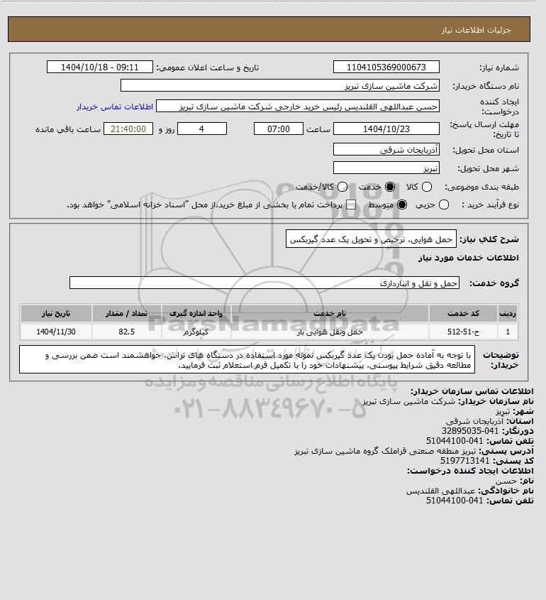 شرح کلی نیاز: حمل هوایی، ترخیص و تحویل یک عدد گیربکس