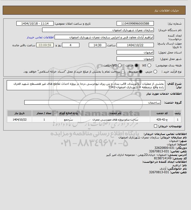 شرح کلی نیاز: بخشی از عملیات آرماتوربندی، قالب بندی و بتن ریزی نیوجرسی درجا در پروژه احداث تقاطع های غیر همسطح شهید فخری زاده واقع درمنطقه 4 شهرداری اصفهان-T342