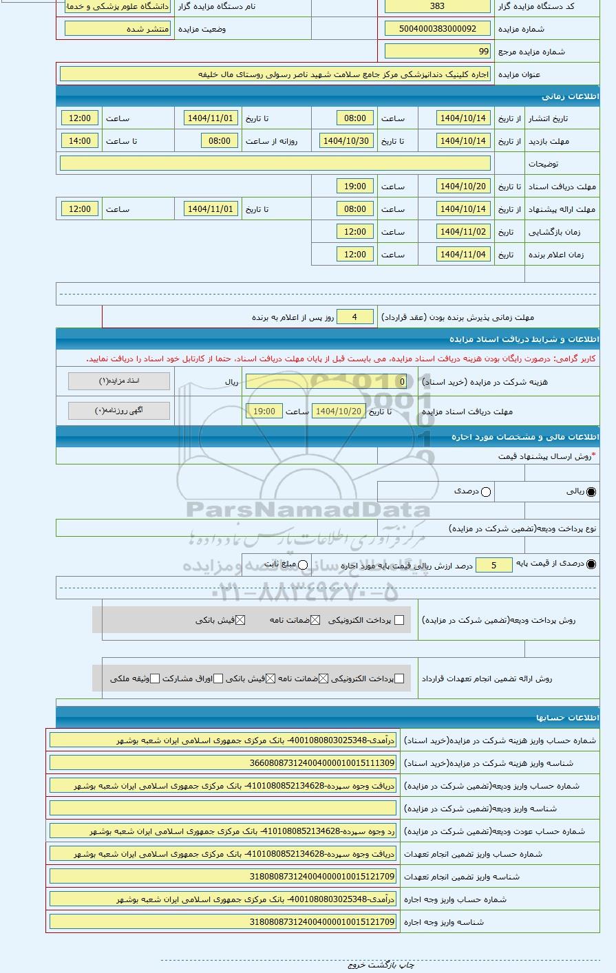 | شماره مورد اجاره | 5104000383000095 | نوع برگزاری مزایده | مزایده عمومی | |