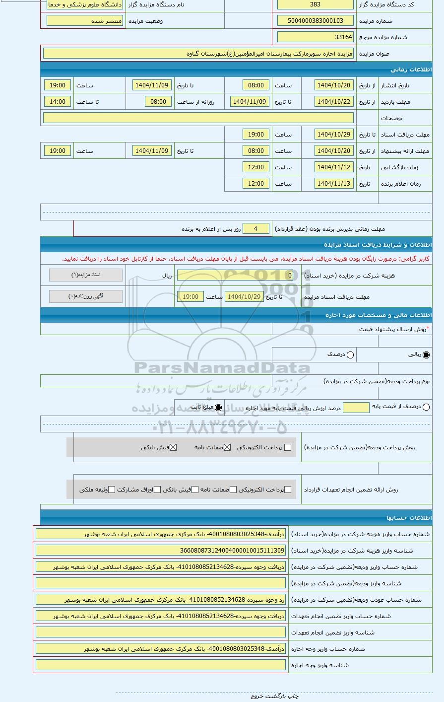 | شماره مورد اجاره | 5104000383000107 | نوع برگزاری مزایده | مزایده عمومی | |