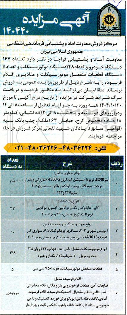 معاونت آماد و پشتیبانی فراجا در نظر دارد تعداد 167 دستگاه خودرو و تعداد 148 دستگاه موتورسیکلت و تعداد 5 دستگاه قطعات منفصل موتورسیکلت و مقادیری اقلام فرسوده را به شرح ذیل از طریق مزایده عمومی به فروش برساند. متقاضیان میتوانند به منظور بازدید و دریافت برگ شرایط شرکت در مزایده از تاریخ درج آگهی تا مورخ 1404.10.30 همه روزه به جز ایام تعطیل از ساعت 8 الی 14 و در (روزهای دوشنبه و پنجشنبه 8 الی 12) به نشانی: کیلومتر 18 جاده مخصوص کرج، خیابان 63 (ملک)، جنب بانک سپه (قوامین سابق)، پادگان شهید لقمانی (مرکز فروش فراجا) مراجعه فرمایند.