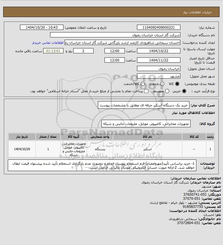 نام دستگاه خریدار:شرکت گاز استان خراسان رضوی