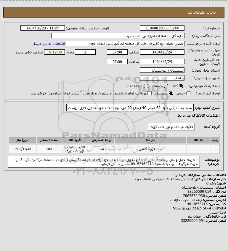 شرح کلی نیاز: سبد پلاستیکی طول 60 عرض 40 ارتفاع 20 مورد نیاز انتقال خون مطابق فایل پیوست