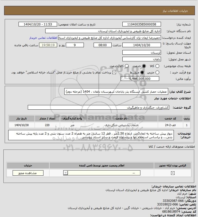 شرح کلی نیاز: عملیات حصار کشی ایستگاه بذر باباجان شهرستان دلفان ، 1404 (مرحله دوم)