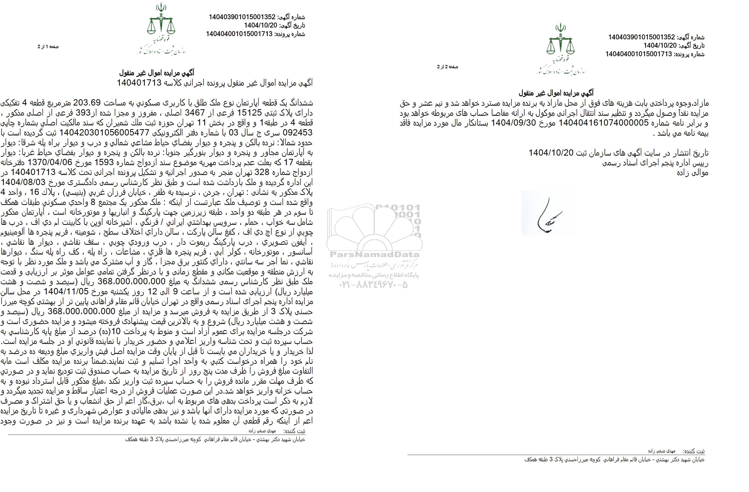 پلاک مذکور به نشانی : تهران ، جردن ، نرسیده به ظفر ، خیابان فرزان غربی (بنیسی) ، پلاک 16 ، واحد 4 واقع شده است و توصیف ملک عبارتست از اینکه : ملک مذکور یک مجتمع 8 واحدی مسکونی طبقات همکف تا سوم در هر طبقه دو واحد ، طبقه زیر زمین جهت پارکینگ و انباریها و موتورخانه است ، آپارتمان مذکور شامل سه خواب ، حمام ، سرویس بهداشتی ایرانی . فرنگی ، آشپزخانه اوپن با کابینت ام دی اف ، درب ها چوبی از نوع اچ دی اف ، کفغ سالن پارکت ، سالن دارای اختلاف سطح ، شومینه ، فریم پنجره ها آلومینیوم ایفون تصویری ، درب پارکینگ ریموت دار ، درب ورودی چوبی ، سقف نقاشی ، دیوار ها نقاشی ، آسانسور ، موتورخانه ، کولر آبی ، فریم پنجره ها فلزی ، مشاعات ، راه پله ، کف راه پله سنگ ، دیوارها نقاشی ، نما اجر سه سانتی ، دارای کنتور برق مجزا ، گاز و آب مشترک می باشد و ملک مورد نظر با توجه به ارزش منطقه و موقعیت مکانی و مقطع زمانی و با در نظر گرفتن تمامی عوامل موثر بر ارزیابی و قدمت ملک طبق نظر کارشناس رسمی ششدانگ به مبلغ 368.000.000.000 ریال (سیصد و شصت و هشت میلیارد ریال) ارزیابی شده است و از ساعت 9 الی 12 روز یکشنبه مورخ 1404.11.05 در محل سالن مزایده اداره پنجم اجرای اسناد رسمی واقع در تهران خیابان قائم مقام فراهانی پایین تر از بهشتی کوچه میرزا حسنی پلاک 3 از طریق مزایده به فروش میرسد و مزایده از مبلغ 368.000.000.000 ریال (سیصد و