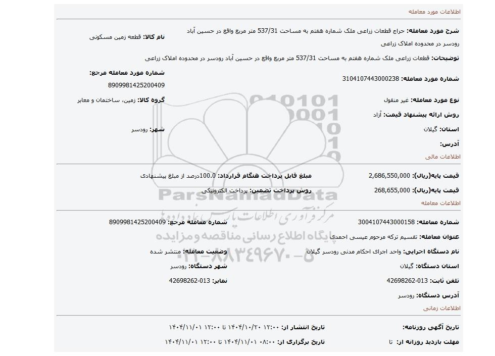 | شرح مورد معامله: حراج قطعات زراعی ملک شماره هفتم به مساحت 537/31 متر مربع واقع در حسین آباد رودسر در محدوده املاک زراعی | نام کالا: قطعه زمین مسکونی | |