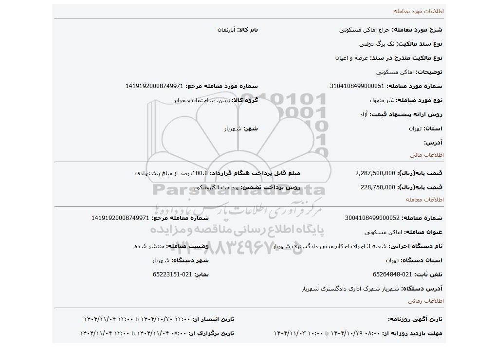 | شرح مورد معامله: حراج اماکن مسکونی | نام کالا: آپارتمان | |