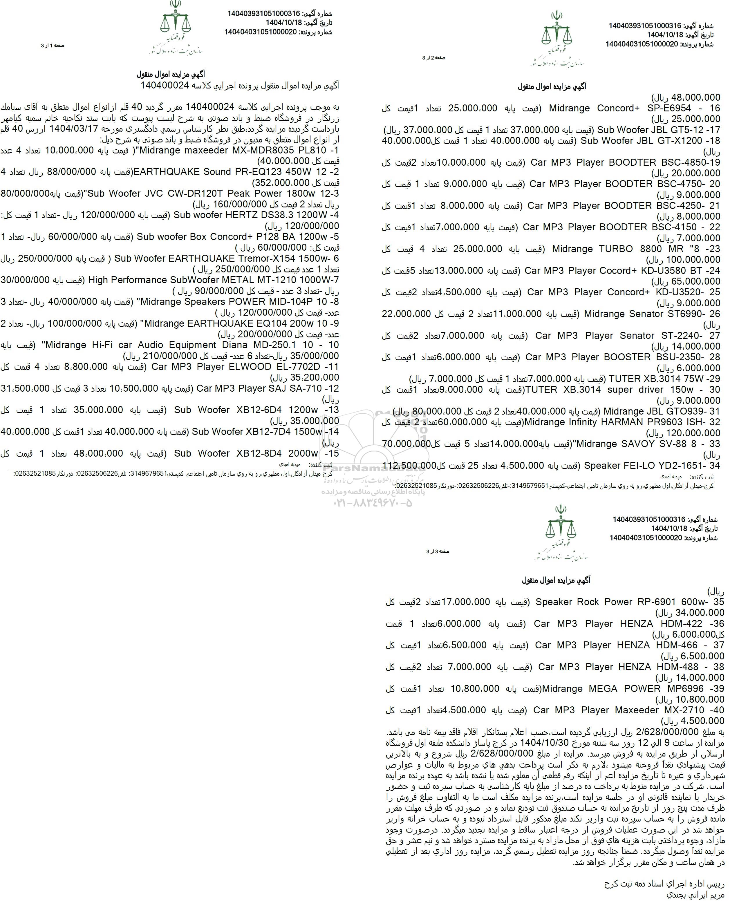 مزایده 40 قلم از انواع اموال متعلق در فروشگاه ضبط و باند صوتی
