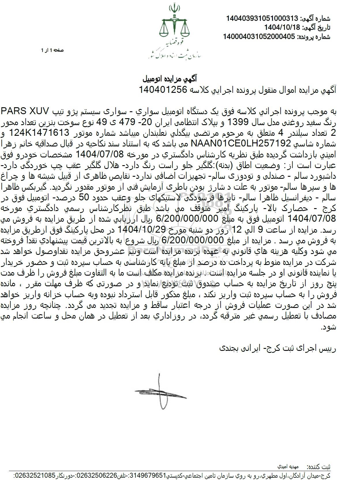 به موجب پرونده اجرائی کلاسه فوق یک دستگاه اتومبیل سواري - سواری سیستم پژو تیپ PARS XUV رنگ سفید روغنی مدل سال 1399 و بپلاک انتظامی ایران 20 479 ی 49 نوع سوخت بنزین تعداد محور 2 تعداد سیلندر 4 متعلق به مرحوم مرتضی بیگدلي نعلبندان میباشد شماره موتور 1241471613 و