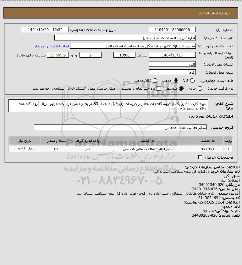 نام دستگاه خریدار:اداره کل بیمه سلامت استان البرز