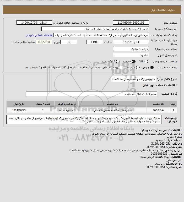 شرح کلی نیاز: سرویس رفت و آمد پرسنل منطقه 8