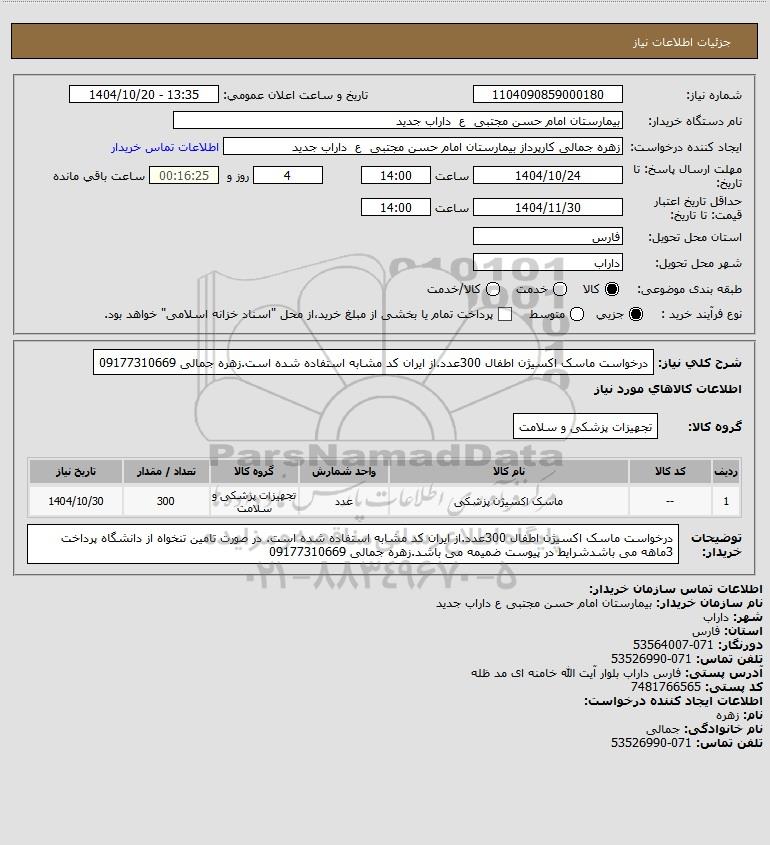 توضیحات خریدار:درخواست ماسک اکسیژن اطفال 300عدد.از ایران کد مشابه استفاده شده است. در صورت تامین تنخواه از دانشگاه پرداخت 3ماهه می باشدشرایط در پیوست ضمیمه می باشد.زهره جمالی 09177310669
