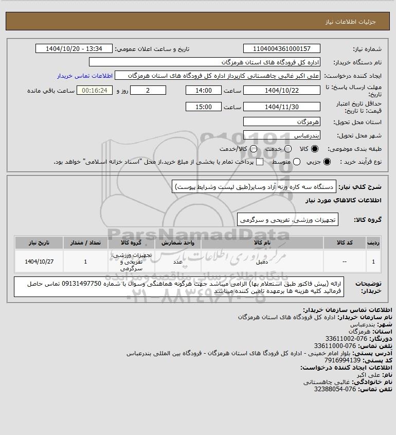 استعلام بها و موضوع استعلام استعلام دستگاه سه کاره وزنه آزاد وسایر(طبق لیست وشرایط پیوست) به اطلاع کلیه شرکتها و افراد متخصص واجد شرایط میرساند، آگهی گذار در نظر دارد از طریق استعلام بها، نسبت به انتخاب و دریافت پیشنهادات اقدام نماید. این استعلام با کد آگهی ثبت شده در سامانه خبرگزاری پارس نماد : 10121550 منتشر شده است. مشخصات استعلام : تاریخ شروع استعلام: 1404/10/20 آخرین مهلت ارسال پیشنهاد قیمت : 1404/10/22 و محل اجرای پروژه : استان مناقصات استان هرمزگان میباشد. استعلام قیمت مورد درخواست : استعلام دستگاه سه کاره وزنه آزاد وسایر(طبق لیست وشرایط پیوست) با دستهبندیهای تخصصی و گروه های مرتبط : تجهیزات ورزشی, استعلام اطلاع رسانی میگردد.