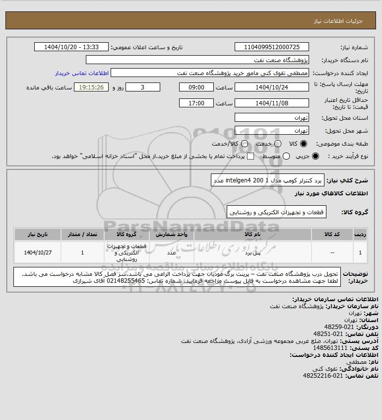 استعلام بها و موضوع استعلام استعلام برد کنترلر کومپ مدل intelgen4 200 1 عدد به اطلاع کلیه شرکتها و افراد متخصص واجد شرایط میرساند، آگهی گذار در نظر دارد از طریق استعلام بها، نسبت به انتخاب و دریافت پیشنهادات اقدام نماید. این استعلام با کد آگهی ثبت شده در سامانه خبرگزاری پارس نماد : 10121569 منتشر شده است. مشخصات استعلام : تاریخ شروع استعلام: 1404/10/20 آخرین مهلت ارسال پیشنهاد قیمت : 1404/10/24 و محل اجرای پروژه : استان مناقصات استان تهران میباشد. استعلام قیمت مورد درخواست : استعلام برد کنترلر کومپ مدل intelgen4 200 1 عدد با دستهبندیهای تخصصی و گروه های مرتبط : انواع تابلو و راکهای مخابراتی و برقی, اتوماسیون ، مراکز کنترل صنعتی, تجهیزات نفت و گاز, تجهیزات برق و الکترونیک, استعلام اطلاع رسانی میگردد.