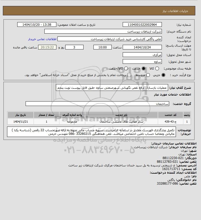شرح کلی نیاز: عملیات بازسازی ورفع نقص نگهبانی شهرصنعتی ساوه -طبق فایل پیوست نوبت پنجم