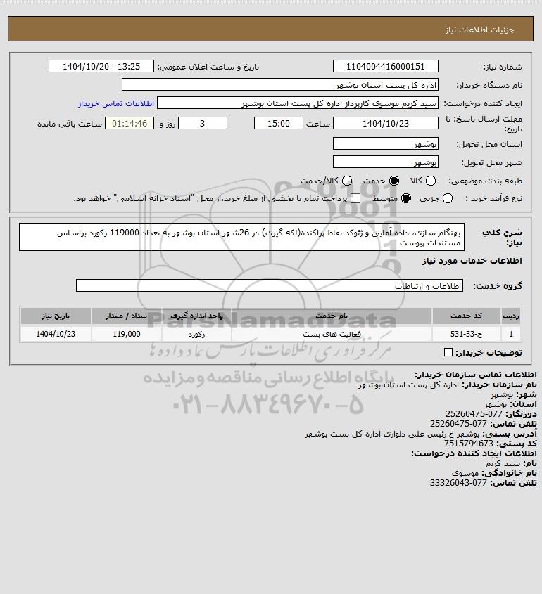 شرح کلی نیاز: بهنگام سازی، داده آمایی و ژئوکد نقاط پراکنده(لکه گیری) در 26شهر استان بوشهر به تعداد 119000 رکورد براساس مستندات پیوست