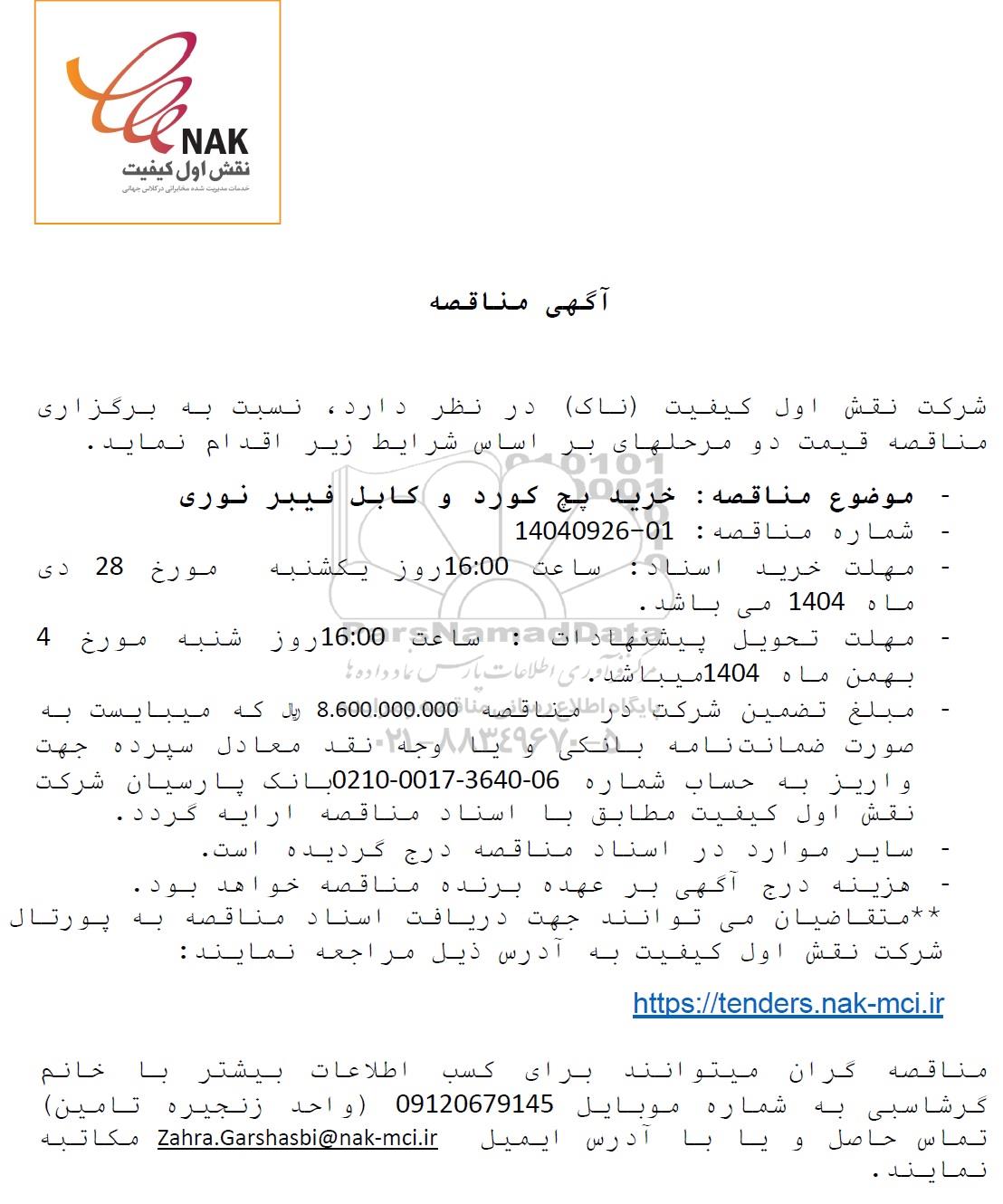 شرکت نقش اول کیفیت (ناک) در نظر دارد، نسبت به برگزاری مناقصه عام دو مرحله ی بر اساس شرایط زیر اقدام نماید.