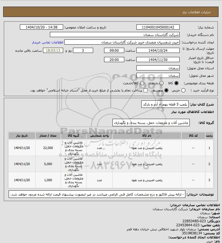 | 2 | -- | پلمپ امنیتی و ضد نفوذ | عدد | ماشین آلات و ملزومات حمل، بسته بندی و نگهداری | 5,000 | 1404/11/20 |