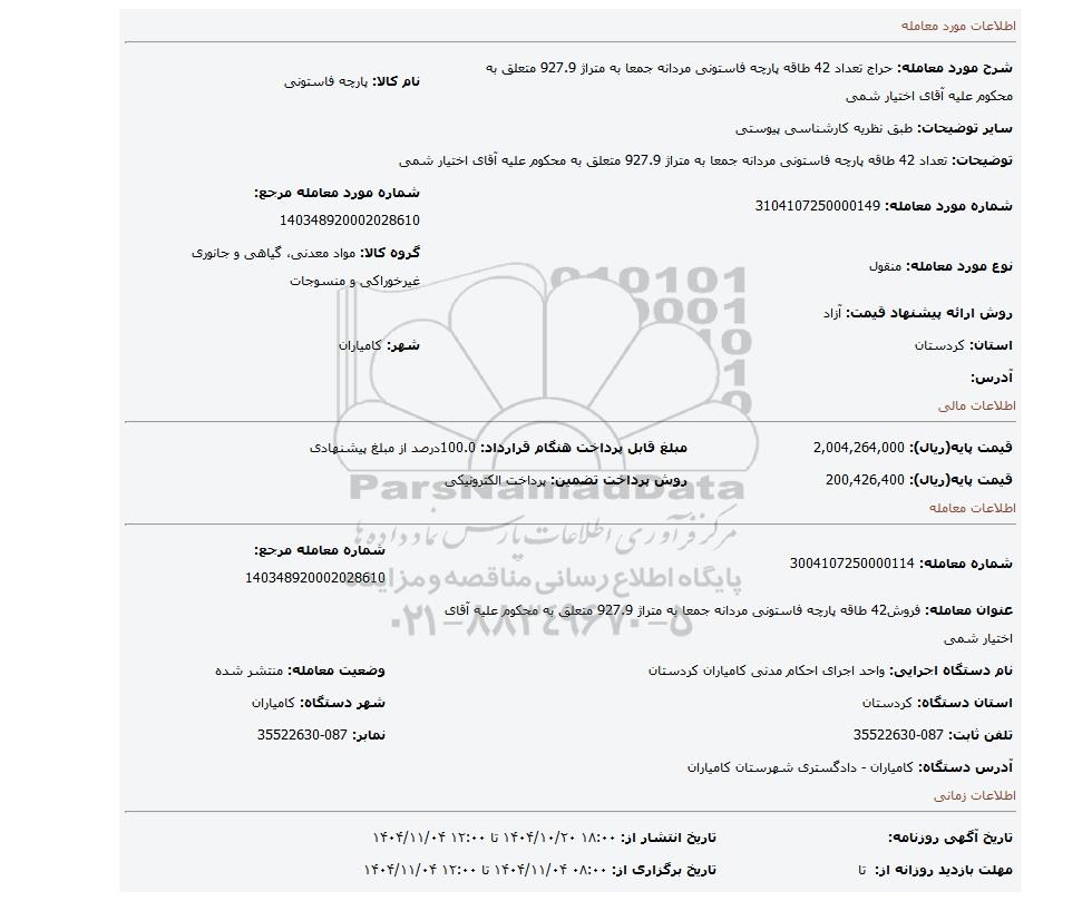 | شرح مورد معامله: حراج تعداد 42 طاقه پارچه فاستونی مردانه جمعا به متراژ 927.9 متعلق به محکوم علیه آقای اختیار شمی | نام کالا: پارچه فاستونی | |