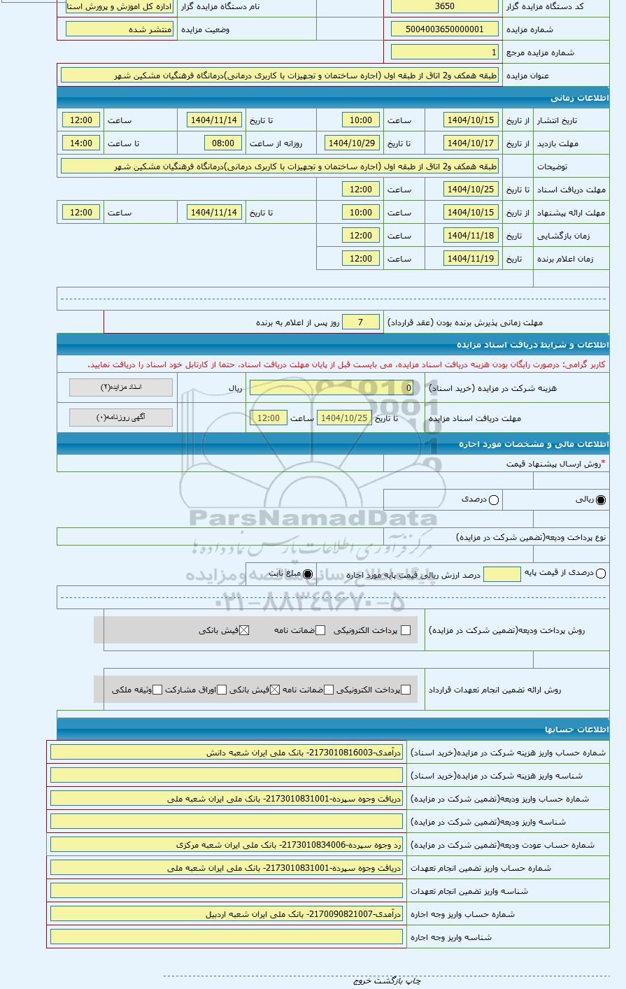 | عنوان مزایده | طبقه همکف و2 اتاق از طبقه اول (اجاره ساختمان و تجهیزات با کاربری درمانی)درمانگاه فرهنگیان مشکین شهر | |||