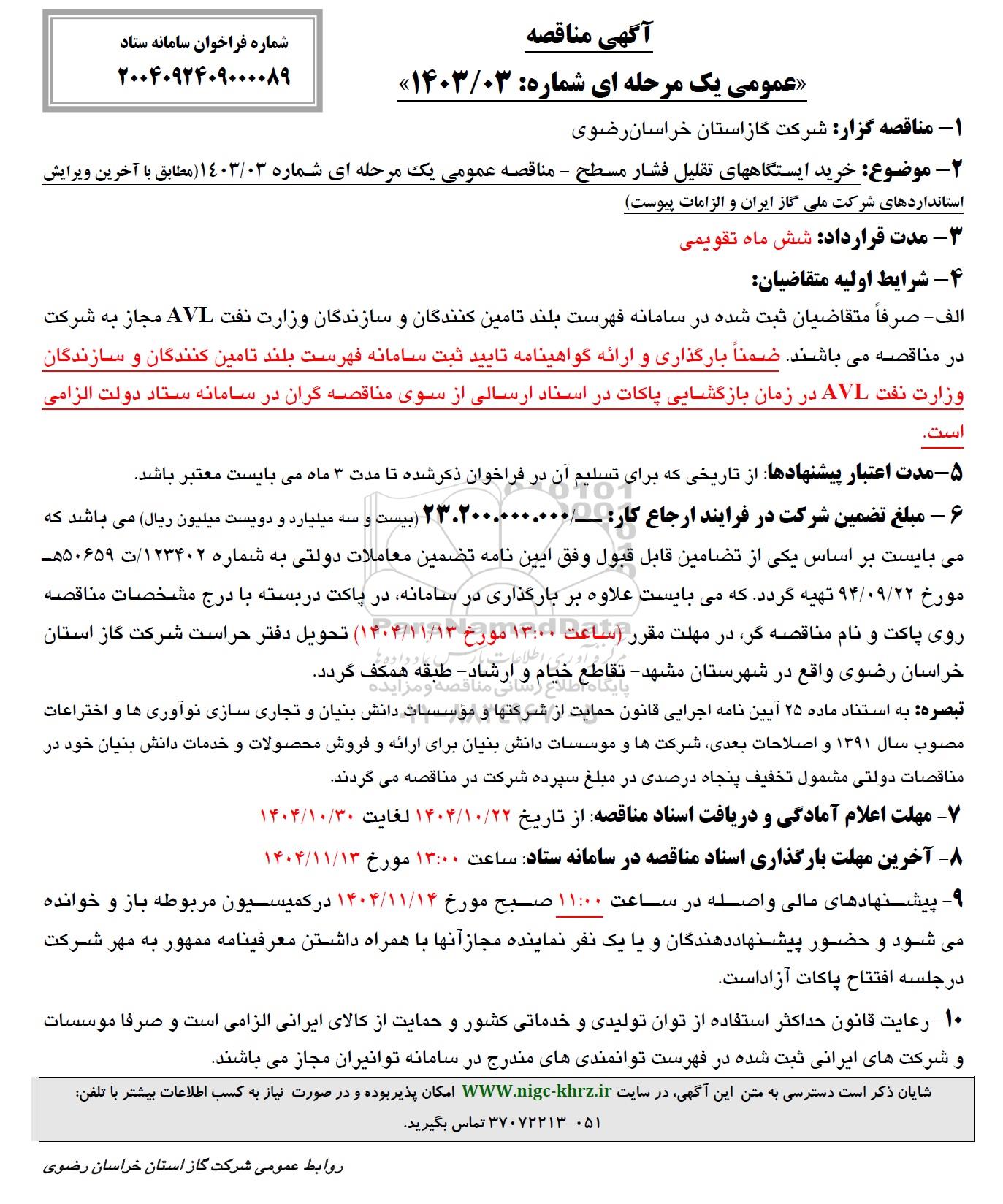 6 - مبلغ تضمین شرکت در فرایند ارجاع کار: 23.200.000.000 بیست و سه میلیارد و دویست میلیون ریال می باشد که می بایست بر اساس یکی از تضامین قابل قبول وفق ایین نامه تضمين معاملات دولتی به شماره 123402 ت 50659 هـ مورخ 94.09.22 تهیه گردد که می بایست علاوه بر بارگذاری در سامانه در پاکت در بسته با درج مشخصات مناقصه روی پاکت و نام مناقصه گر، در مهلت مقرر ساعت 13:00 مورخ 1404.11.13 تحويل دفتر حراست شرکت گاز استان خراسان رضوی واقع در شهرستان مشهد تقاطع خیام و ارشاد - طبقه همکف گردد.