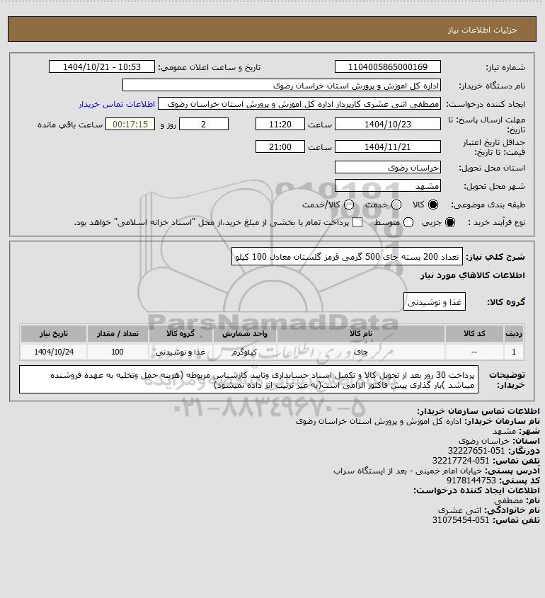 شرح کلی نیاز: تعداد 200 بسته چای 500 گرمی قرمز گلستان معادل 100 کیلو