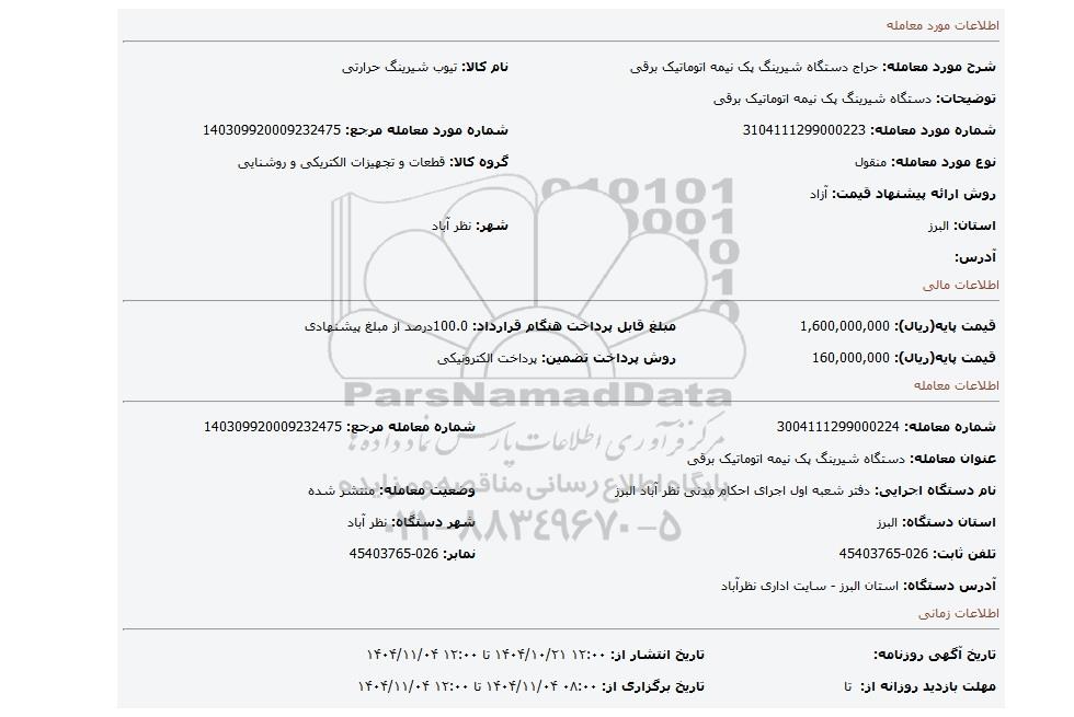 | نام دستگاه اجرایی: دفتر شعبه اول اجرای احکام مدنی نظر آباد البرز | وضعیت معامله: منتشر شده | |