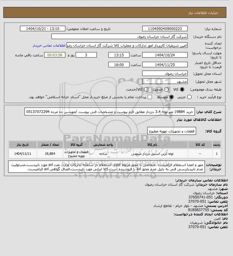 شرح کلی نیاز: خرید 19884 متر لوله 3.4 درزدار مطابق فرم پیوست و مشخصات فنی پیوست /مهندس ده مرده 05137072294