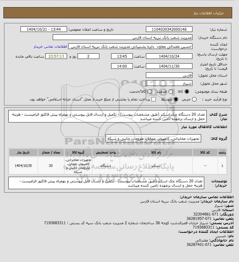 شرح کلی نیاز: تعداد 20 دستگاه چک اسکنر (طبق مشخصات پیوست) - تکمیل و ارسال فایل پیوستی و بهمراه پیش فاکتور الزامیست - هزینه حمل و ارسال برعهده تامین کننده میباشد