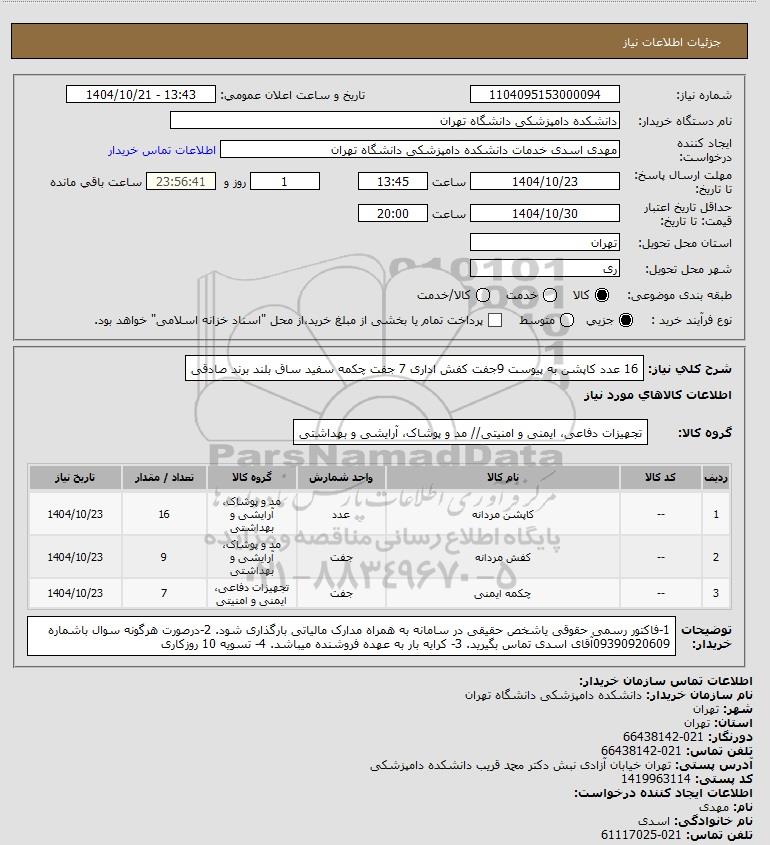 استعلام بها و موضوع استعلام استعلام 16 عدد کاپشن به پیوست 9جفت کفش اداری 7 جفت چکمه سفید ساق بلند برند صادقی به اطلاع کلیه شرکتها و افراد متخصص واجد شرایط میرساند، آگهی گذار در نظر دارد از طریق استعلام بها، نسبت به انتخاب و دریافت پیشنهادات اقدام نماید. این استعلام با کد آگهی ثبت شده در سامانه خبرگزاری پارس نماد : 10125819 منتشر شده است. مشخصات استعلام : تاریخ شروع استعلام: 1404/10/21 آخرین مهلت ارسال پیشنهاد قیمت : 1404/10/23 و محل اجرای پروژه : استان مناقصات استان تهران میباشد. استعلام قیمت مورد درخواست : استعلام 16 عدد کاپشن به پیوست 9جفت کفش اداری 7 جفت چکمه سفید ساق بلند برند صادقی با دستهبندیهای تخصصی و گروه های مرتبط : البسه و پوشاک, سیستم ایمنی ، اتش نشانی،اعلام و اطفای حریق, کفش, استعلام اطلاع رسانی میگردد.