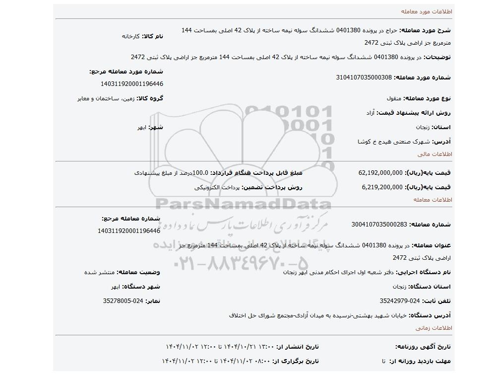 | عنوان معامله: در پرونده 0401380 ششدانگ سوله نیمه ساخته از پلاک 42 اصلی بمساحت 144 مترمربع جز اراضی پلاک ثبتی 2472 | ||