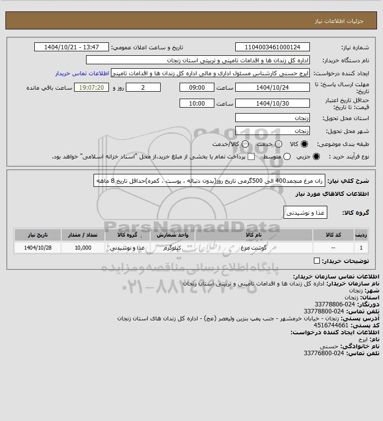 شرح کلی نیاز: ران مرغ منجمد400 الی 500گرمی تاریخ روز(بدون دنباله ، پوست ، کمره)حداقل تاریخ 8 ماهه