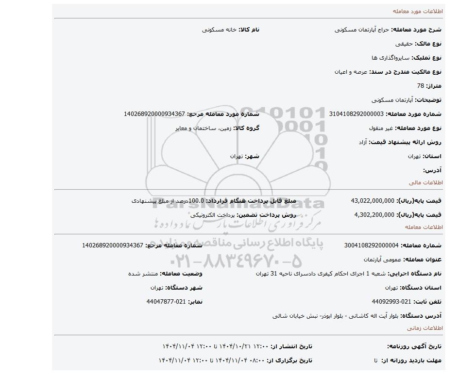 | شرح مورد معامله: حراج آپارتمان مسکونی | نام کالا: خانه مسکونی | |