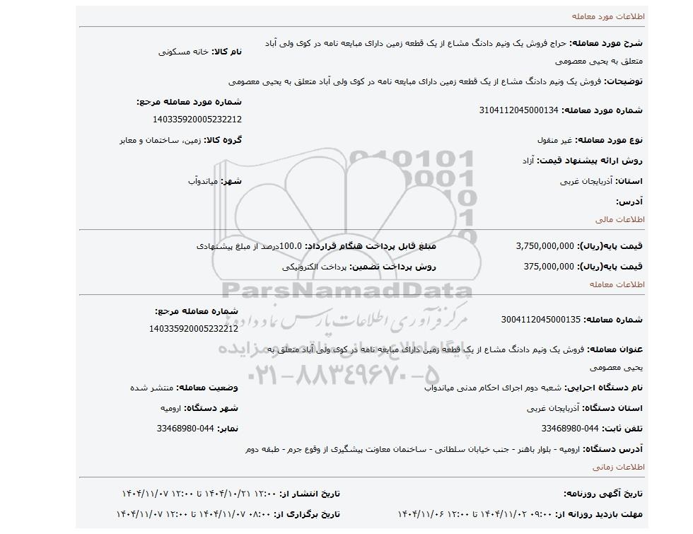 مزایده عمومی مزایده فروش یک ونیم دادنگ مشاع از یک قطعه زمین دارای مبایعه نامه در کوی ولی آباد متعلق به یحیی معصومی برگزار میگردد. از کلیه افراد متخصص و شرکتهای واجد شرایط دعوت به عمل میآید تا در این مزایده با کد خبرگزاری پارس نماد : 10125866 شرکت نمایند تاریخ شروع مزایده : 1404/10/21 مهلت شرکت در مزایده: تا پایان روز 1404/11/07 مکان برگزاری اموال واگذاری استانهای مزایدات استان آذربایجان غربی و دستهبندیهای مربوط به این حراجی املاک و زمین میباشد.