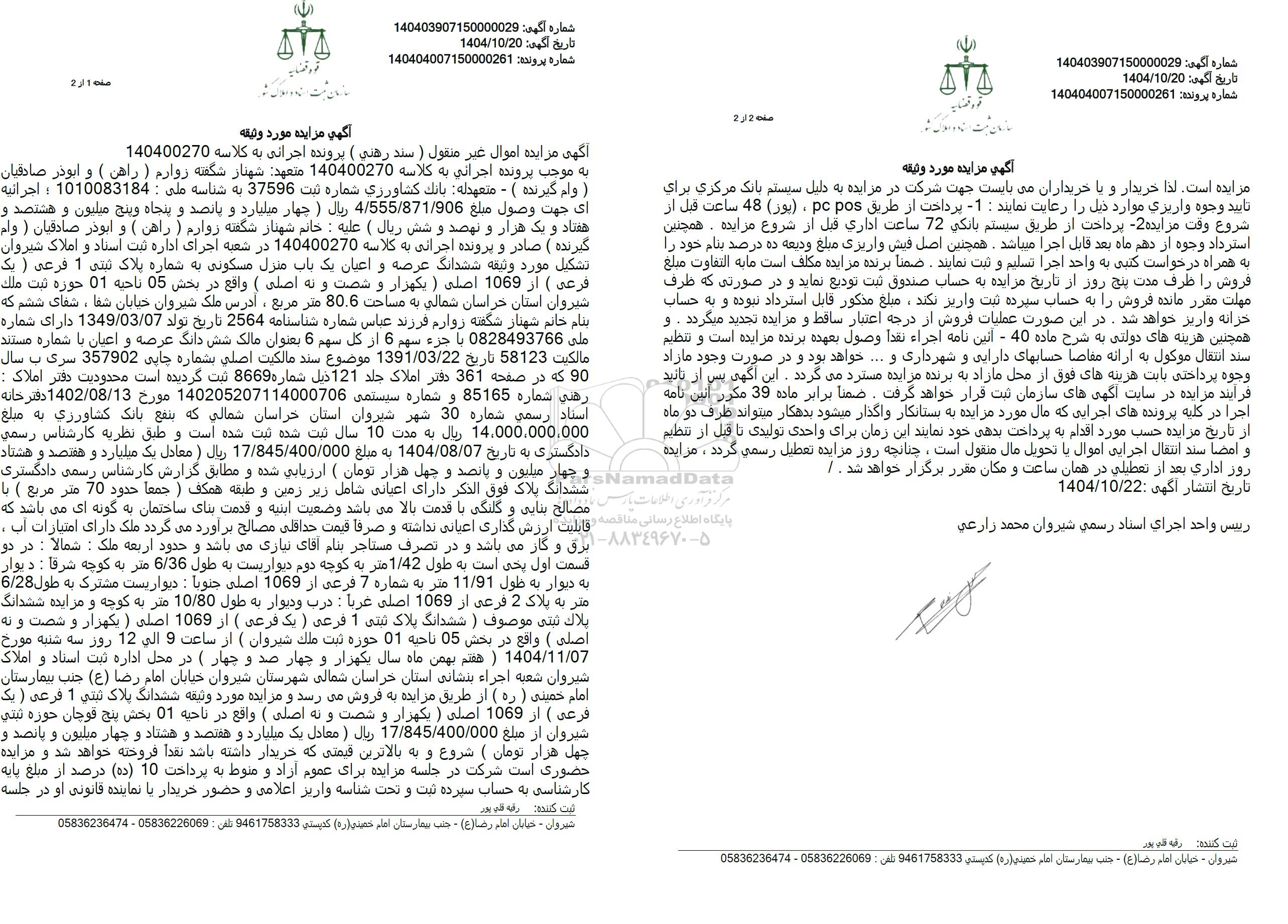 آگهی مزایده اموال غیرمنقول (سند رهنی) کلاسه 140400270