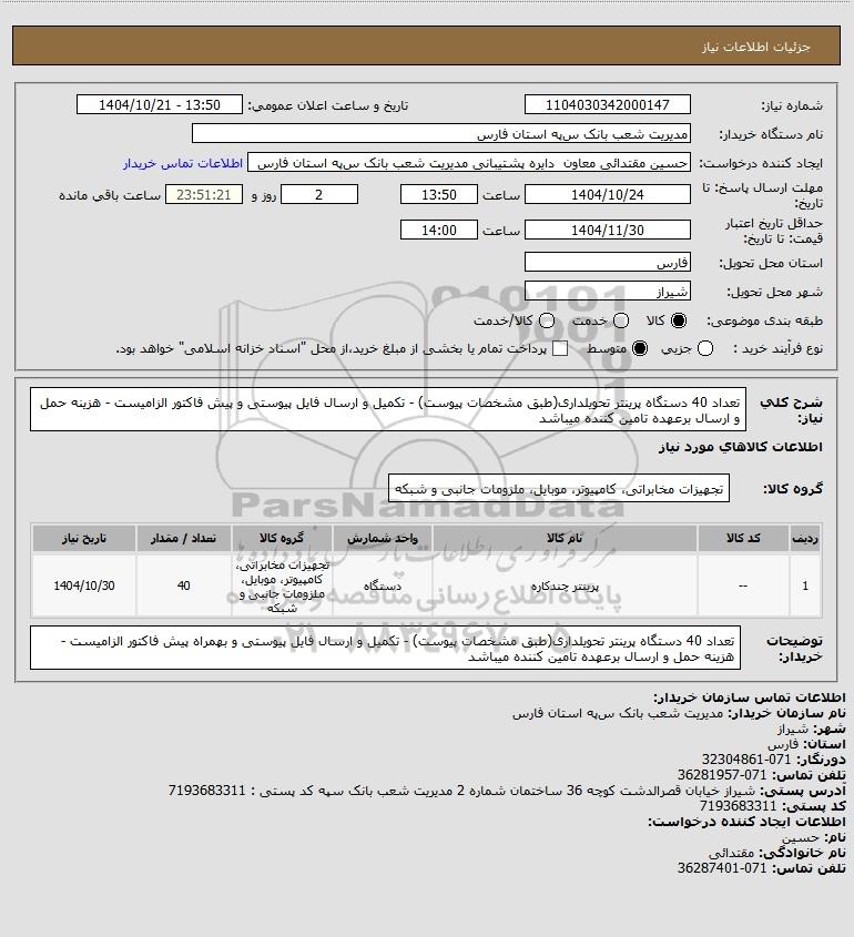 استعلام بها و موضوع استعلام استعلام تعداد 40 دستگاه پرینتر تحویلداری(طبق مشخصات پیوست) - تکمیل و ارسال فایل پیوستی و پیش فاکتور الزامیست - هزینه حمل و ارسال برعهده تامین کننده میباشد به اطلاع کلیه شرکتها و افراد متخصص واجد شرایط میرساند، آگهی گذار در نظر دارد از طریق استعلام بها، نسبت به انتخاب و دریافت پیشنهادات اقدام نماید. این استعلام با کد آگهی ثبت شده در سامانه خبرگزاری پارس نماد : 10125898 منتشر شده است. مشخصات استعلام : تاریخ شروع استعلام: 1404/10/21 آخرین مهلت ارسال پیشنهاد قیمت : 1404/10/24 و محل اجرای پروژه : استان مناقصات استان فارس میباشد. استعلام قیمت مورد درخواست : استعلام تعداد 40 دستگاه پرینتر تحویلداری(طبق مشخصات پیوست) - تکمیل و ارسال فایل پیوستی و پیش فاکتور الزامیست - هزینه حمل و ارسال برعهده تامین کننده میباشد با دستهبندیهای تخصصی و گروه های مرتبط : کامپیوتر, ماشین اداری, استعلام اطلاع رسانی میگردد.